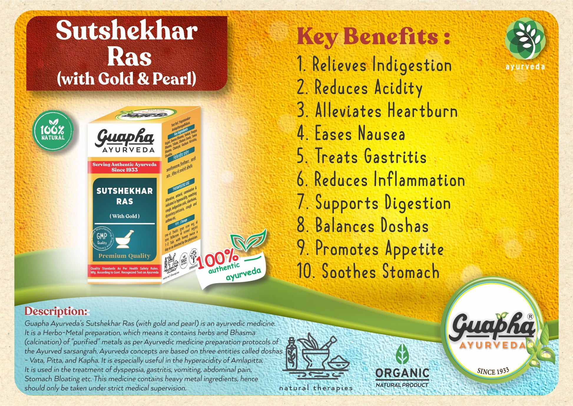 Guapha Ayurveda Sutshekhar Ras is a potent Ayurvedic formulation designed to balance the body's digestive fire (Agni) and alleviate issues related to acidity, indigestion, and gastric discomfort. Made with a blend of herbs and minerals, including Shuddha Parad (Purified Mercury) and Shuddha Gandhak (Purified Sulfur), it helps reduce inflammation, ease heartburn, and promote smooth digestion. This classical Ayurvedic remedy is also effective in managing headaches, nausea, and vomiting caused by digestive imbalances. Ideal for those looking to restore digestive harmony, Sutshekhar Ras offers a holistic solution for maintaining gut health and overall well-being.