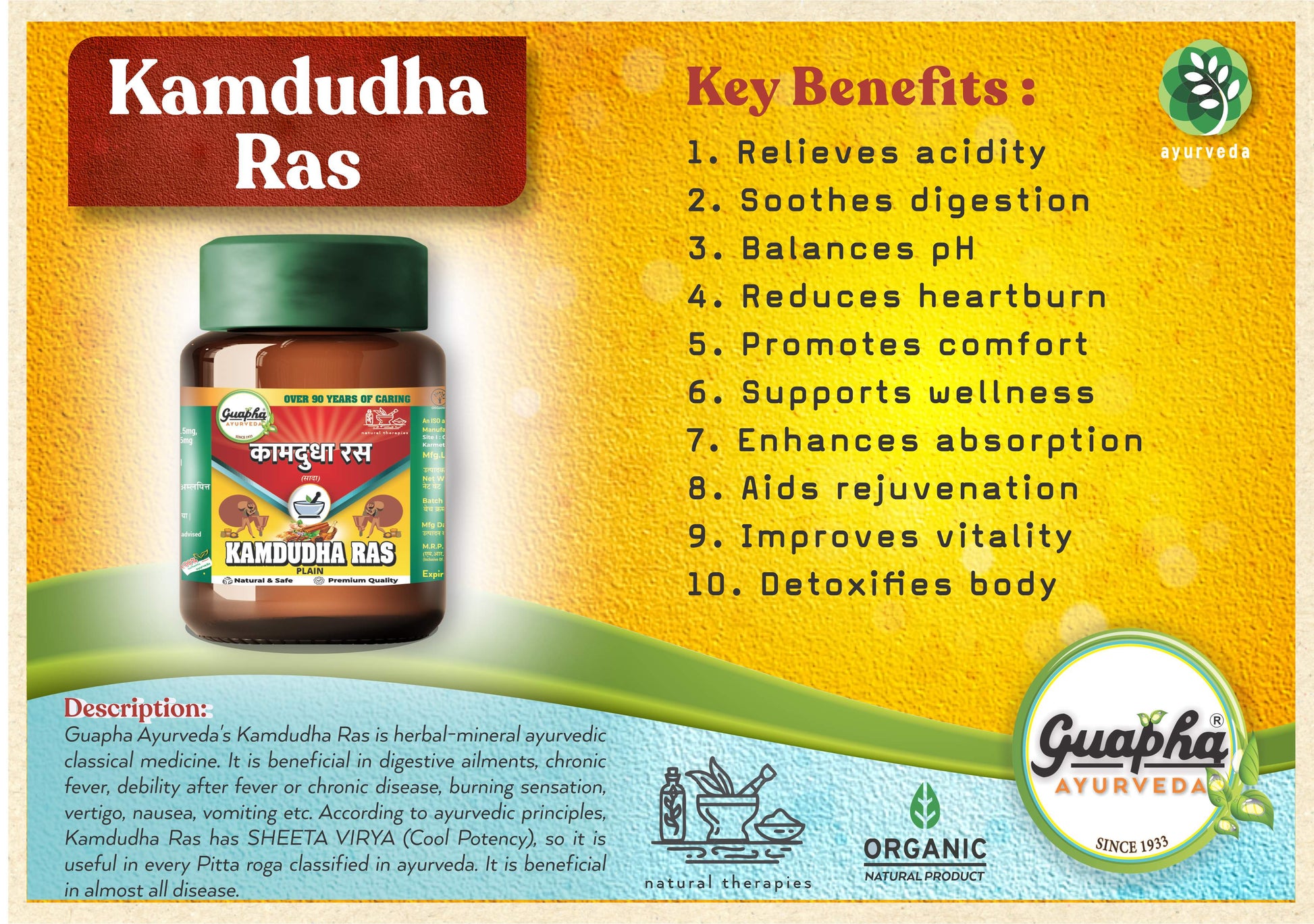 Guapha Ayurveda Kamdudha Ras Plain is a renowned Ayurvedic formulation designed to provide effective relief from digestive discomfort and acidity. This soothing remedy is crafted with natural ingredients that help balance the stomach's pH levels, alleviate heartburn, and promote healthy digestion. Ideal for those experiencing gastric issues, Kamdudha Ras Plain supports nutrient absorption and enhances overall wellness. It is a gentle yet potent solution for maintaining digestive harmony, rejuvenating the body, and promoting vitality. Experience the power of traditional Ayurveda with Guapha Kamdudha Ras Plain, your natural choice for digestive health and comfort.