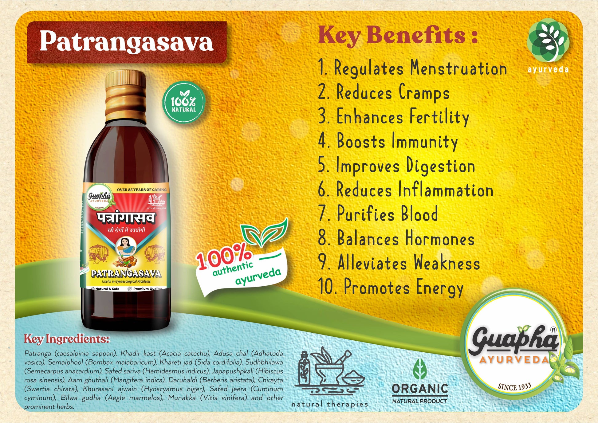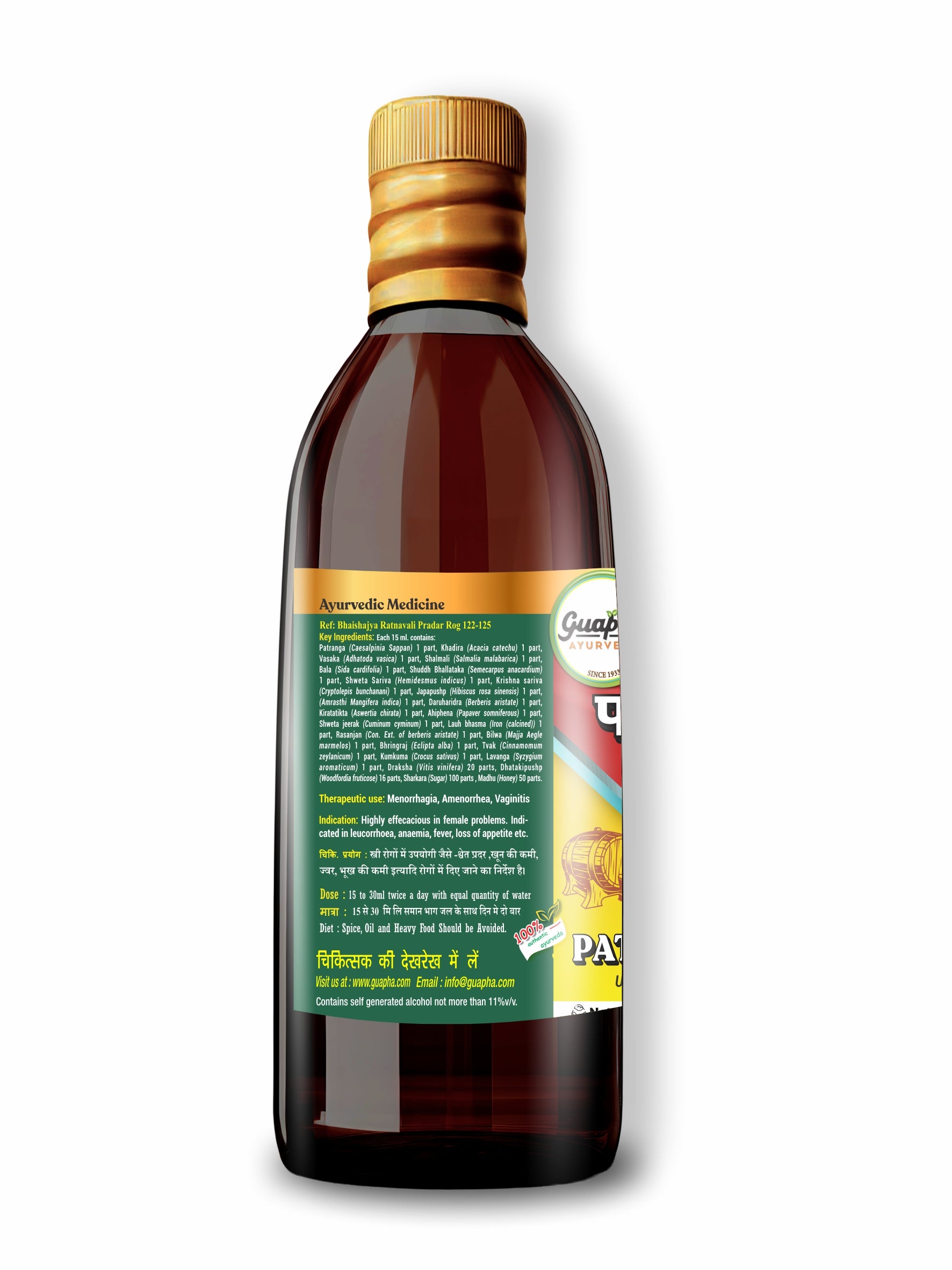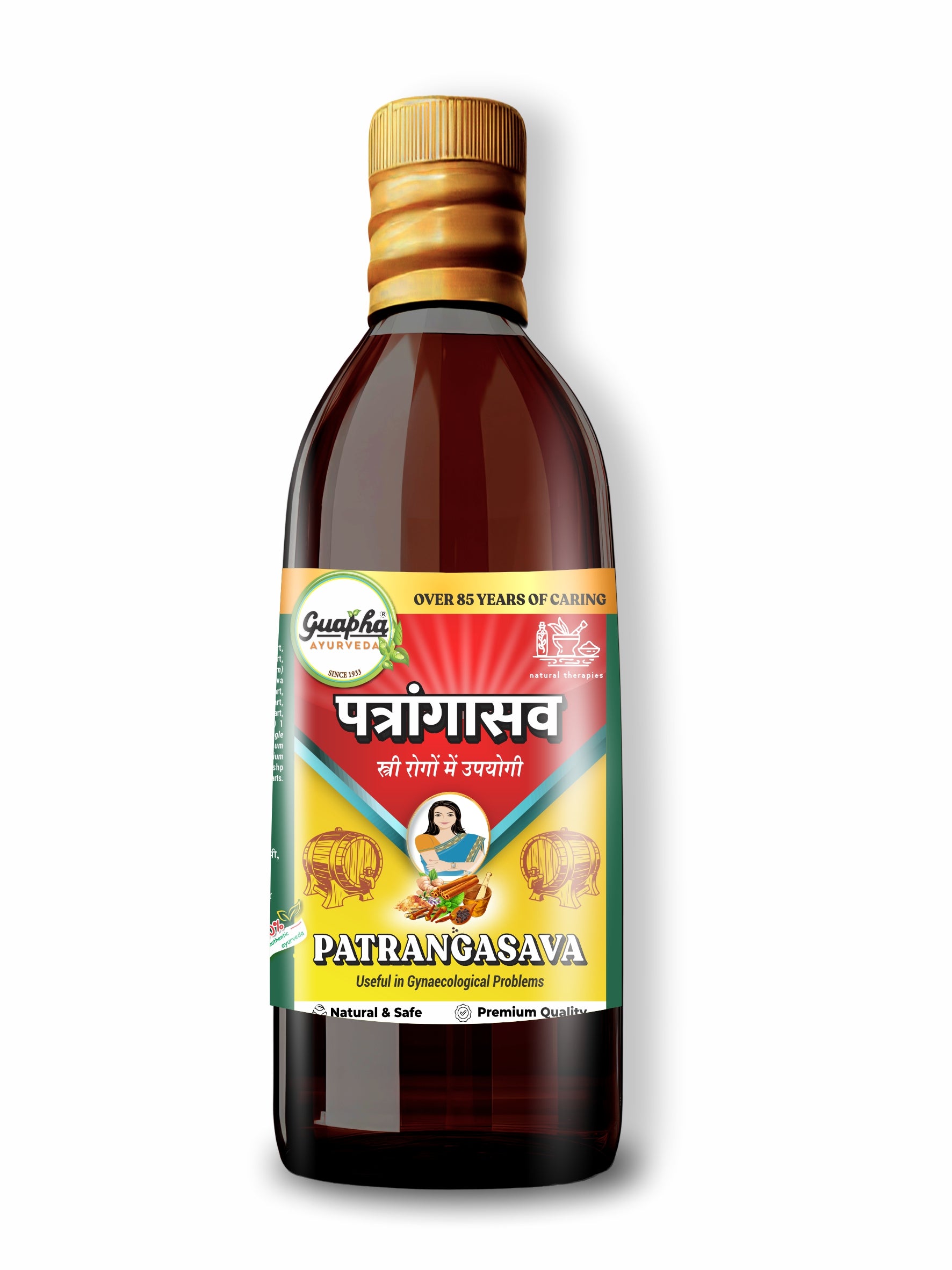 Guapha Ayurveda Patrangasava is a traditional Ayurvedic tonic designed to support women's health, focusing on hormonal balance, menstrual wellness, and reproductive health. Enriched with potent herbs like Patranga, Ashoka, and Daruharidra, it helps alleviate menstrual discomfort, promotes regular cycles, and nourishes the reproductive system. This unique blend works to restore energy levels, support digestion, and improve skin health. Guapha Ayurveda Patrangasava is crafted with care to enhance women's vitality and overall well-being, providing a natural approach to maintaining physical and emotional balance.