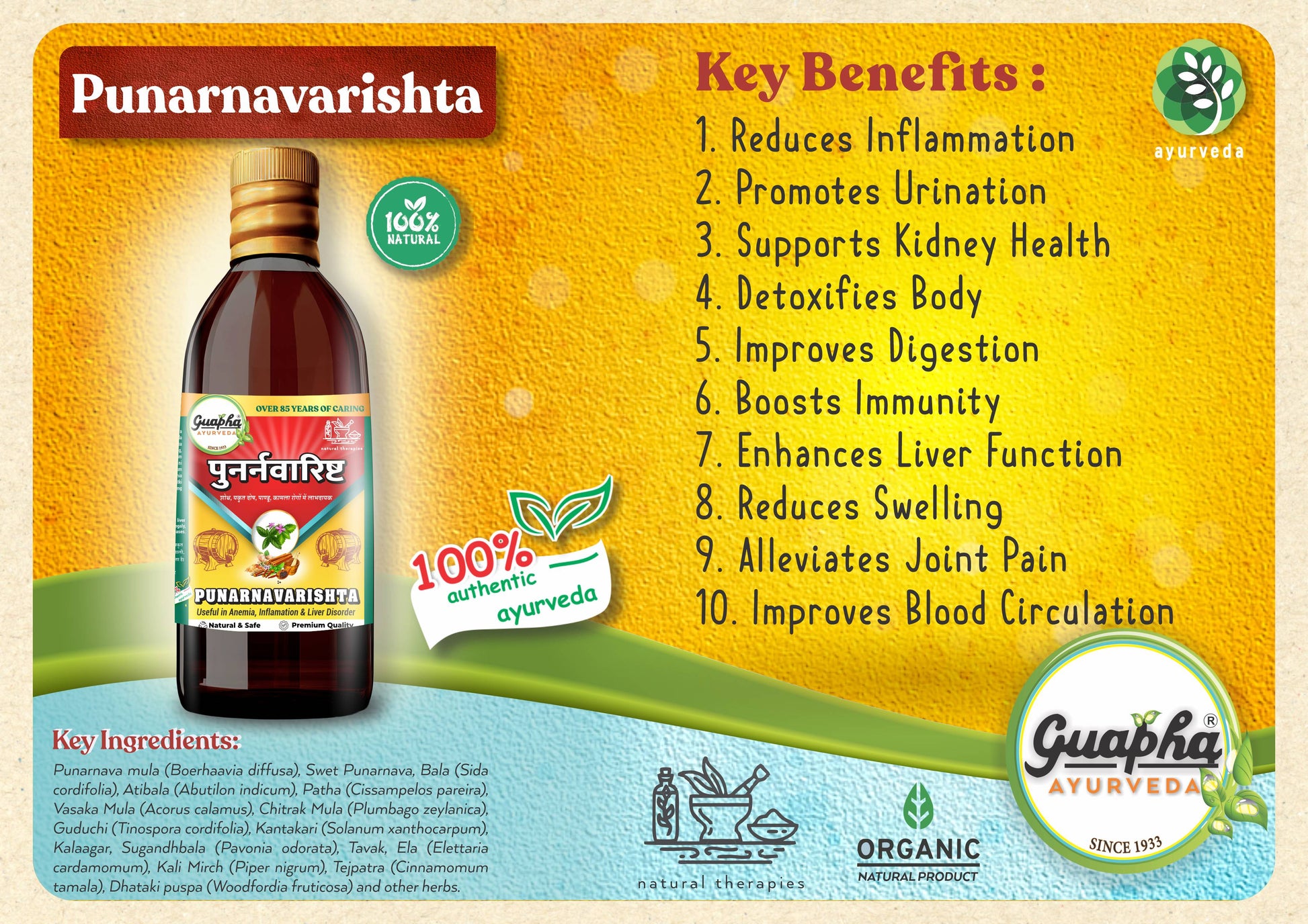 Guapha Ayurveda Punarnavarishta is an effective Ayurvedic formulation designed to promote kidney and urinary health. Known for its detoxifying properties, this herbal tonic helps reduce inflammation and supports the body's natural ability to eliminate waste. With key ingredients like Punarnava (Boerhavia diffusa), it aids in improving kidney function, reducing swelling, and supporting healthy fluid balance in the body. Regular use of Punarnavarishta helps manage conditions like edema and urinary tract infections (UTIs) while promoting overall well-being. Ideal for those seeking a natural solution for kidney and urinary support, it offers a holistic approach to wellness.