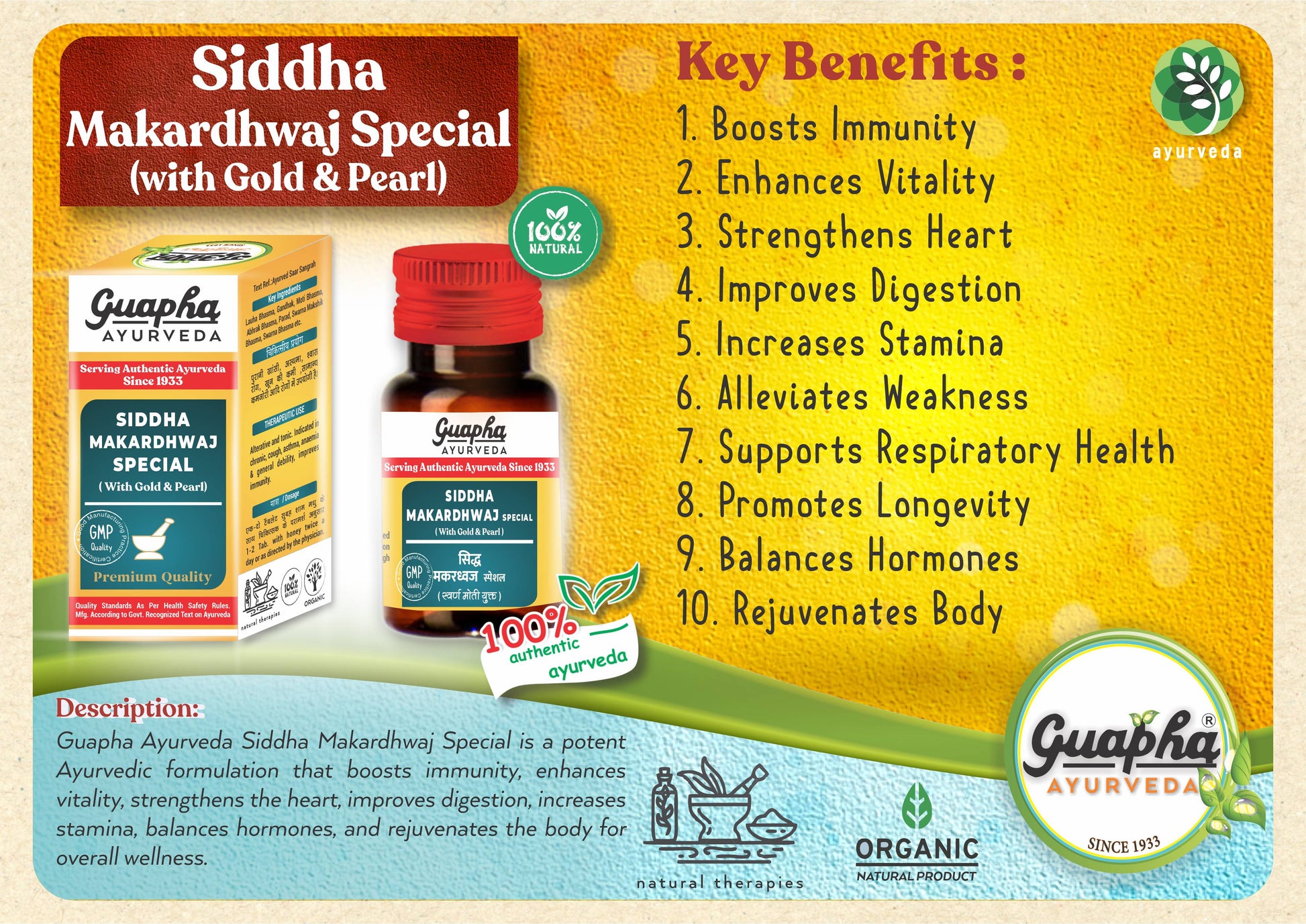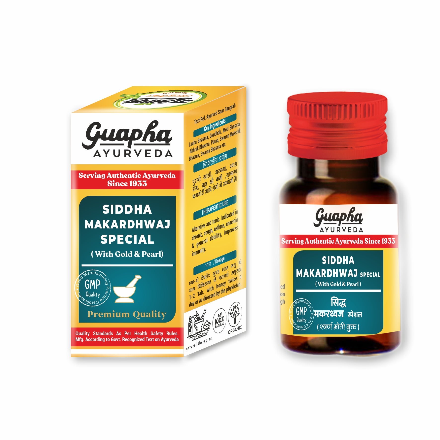 Guapha Ayurveda Siddha Makardhwaj Special With Gold & Pearl Tablets are a powerful Ayurvedic formulation designed to boost vitality, energy, and overall well-being. Enriched with Swarna Bhasma (Gold) and Mukta Pishti (Pearl), these tablets help enhance strength, stamina, and immunity. They are particularly beneficial for those experiencing weakness, fatigue, or low energy. Siddha Makardhwaj is also known to improve mental clarity, promote heart health, and support the body’s natural rejuvenation processes. Ideal for improving vitality and combating physical or mental stress, these tablets offer a holistic approach to maintaining optimal health and wellness through Ayurveda.