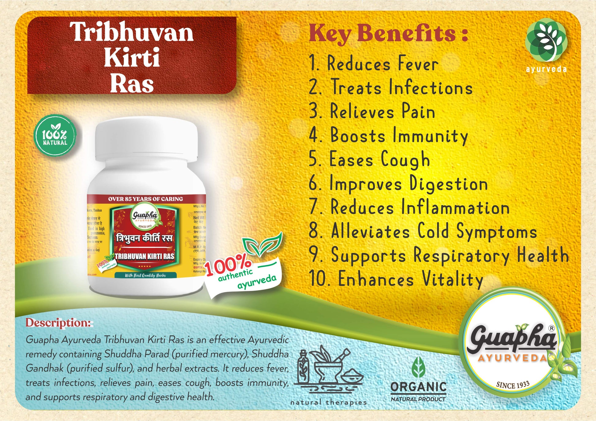 Guapha Ayurveda Tribhuvan Kirti Ras is a traditional Ayurvedic formulation designed to provide effective relief from fever, cold, and respiratory infections. Enriched with potent herbs, this remedy helps to boost immunity, enhance vitality, and promote overall wellness. It works by alleviating symptoms associated with infections while strengthening the body’s natural defenses. Ideal for individuals experiencing frequent colds or flu-like symptoms, Tribhuvan Kirti Ras balances the doshas and supports respiratory health. With a unique blend of natural ingredients, this formulation is your go-to solution for maintaining optimal health and recovering from seasonal ailments. Experience the power of Ayurveda with Guapha Ayurveda!